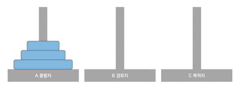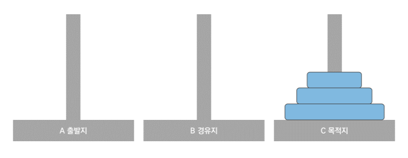 세 개의 장대가 있고 첫 번째 장대에는 반경이 서로 다른 n개의 원판이 쌓여 있다. 각 원판은 반경이 큰 순서대로 쌓여있다. 이제 수도승들이 다음 규칙에 따라 첫 번째 장대에서 세 번째 장대로